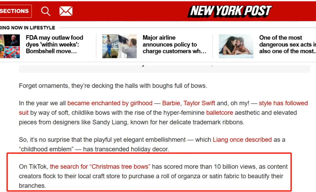 蝴蝶结作为是一种“童年的象征”,已超越了大多数节日装饰品。在圣诞节期间, TikTok 上关于“圣诞树蝴蝶结”的搜索量已超过 100 亿次,内容创作者纷纷涌向当地的工艺品商店,购买卷纱或缎子布料来美化他们的圣诞树。
