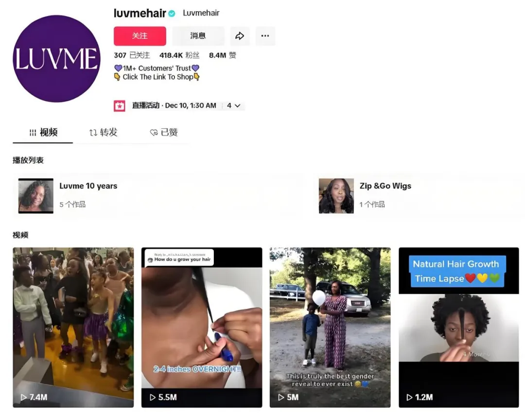 Luvme Hair 品牌的自有频道发布了许多与假发相关的实用视频,例如假发护理技巧、新手教程和客户真实反馈。这种富有价值的视频内容,能够帮助消费者更好地了解产品,从而提升对品牌的信任。