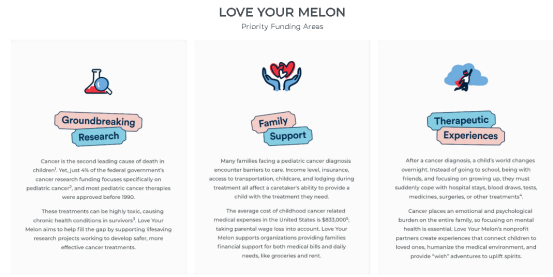 自 2012 年创立以来,在完成最初 45000 顶帽子的初期目标后,此后每售出一件产品, Love Your Melon 就会向世界各地领导抗击儿童癌症的非营利组织捐赠 1 美元。根据 Love Your Melon 官网的介绍,品牌如今已经向多个儿童癌症基金会捐赠超过 980 万美元和 27 万顶帽子。
