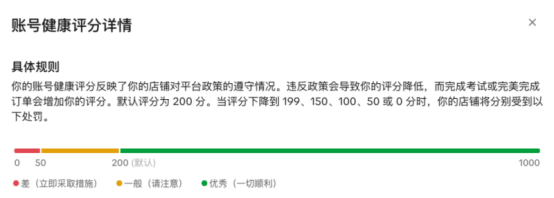 账号健康评分是平台处罚规则的关键部分,以 0 到 1000 分的数字分数形式呈现,用不同颜色区分,能快速显示商家账号健康情况。