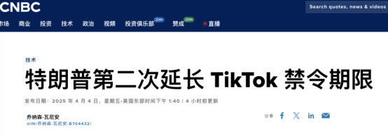 当地时间 4 月 4 日,美国总统特朗普在社交媒体宣布,将再次推迟执行针对TikTok的“不卖就禁”法案 75 天至 2025 年 6 月 19 日。