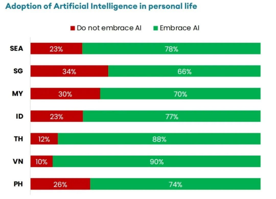 近期,一项由 Lazada 与 Kantar Profiles 合作发布的报告揭示了 AI 在东南亚地区的普及程度,其广泛程度令人瞩目。数据显示,78% 的消费者在个人生活中积极拥抱 AI,尤其在印尼、泰国和越南,人们对使用 AI 的产品和服务展现了高度信任。