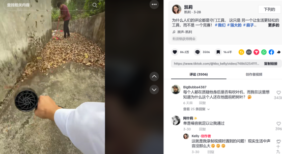 视频中,该博主手持一个小型的便携式鼓风机,将满是落叶的院子“只费吹灰之力”就打扫得一干二净,且全程仅需几分钟,效率极高,与人工使用扫把扫除相比简直是降维打击般的存在。许多网友在该视频留言区纷纷评论道,不敢相信这么小的鼓风机竟然有这么强大的动力;一些已经使用过的用户则表示,这个鼓风机的效果确实很好,自己还用它来吹干洗清洗后的车。