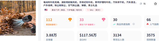 TT123 发现,数据显示,在过去 7 天内(3.24-3.30),该款手持鼓风机已卖出了 7114 台,周销量增长率达 1145.88%,销售额超 19.84 万美元(约合人民币 144.82 万元)。