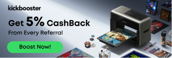 除了自身的产品力与变现潜力,EufyMake E1 在众筹阶段还能火爆出圈,离不开它背后一套别具巧思的全民推广激励机制。为了进一步撬动社交传播势能,EufyMake 在 Kickstarter 同步启动了 Kickbooster 推荐返利计划,支持者只需注册即可获得专属推广链接,成功推荐 1 名新支持者参与众筹,就能获得该订单金额 5% 的现金返利。这种零门槛、强激励的机制,毫无疑问激发了用户自传播、自带货的动力,同时也放大了众筹项目的社交传播半径,助力 EufyMake E1 在短时间内完成了从产品到现象级众筹爆品的跃迁。