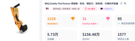 凭借着强大的功能,该款烤架刷迅速捕获美国消费者的心。截至目前,其总销量已超过 5.73 万,总 GMV 达 156.48 万美元(约合人民币 1142 万元)。