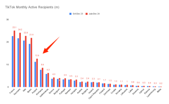 根据 TikTok 官方发布的欧盟执行和使用数据报告,在 2024 年 7 月至 12 月期间,TikTok 在欧盟地区的月活跃用户达到 1.591 亿人,较上一统计周期净增长 900 万人。其中,波兰地区的 TikTok 用户数量达到 1260 万,在欧洲国家中排名第五。