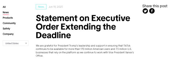 在该行政命令发布不久后,TikTok 也迅速通过官方网站发布一则声明回应:“我们感谢特朗普总统的领导和支持,确保 TikTok 继续为超过 1.7 亿美国用户和 750 万家依赖该平台的美国企业提供服务,同时我们将继续与万斯副总统办公室合作。”