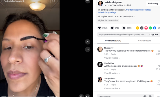 用一支黑色染眉胶,顺着眉毛的轮廓仔细勾勒描绘,等待一段时间后,撕下眉胶,就得到了一副精致的眉形。这是 TikTok 上一位用户名为 @arielrodriguezz 的博主,近日在发布的视频中,向用户展示自己使用撕拉式染眉胶的过程。原本眉毛稀疏,颜色较浅的她,在使用染眉胶后瞬间变成浓密高挑眉,如此完美的效果,让该条视频迅速引起超百万用户围观。