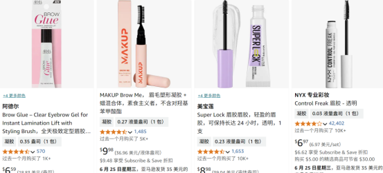 此外,在亚马逊美国站上,多功能眉笔、定性透明眉胶、染眉膏等产品也一直处于热销趋势。其中,有多款眉毛塑形凝胶的月销量超过 10000+ 单。