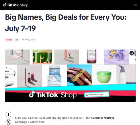 TT123 获悉,据 TikTok Shop 官方此前发布的定档日期,TikTok 美区全托管将于 6 月 26 日-7 月 19 日,POP 将于 7 月 7 日-7 月 19 日,举办“Deals for You Days”夏季年中促销活动。其中,美区 POP 的开始时间比亚马逊官宣的 Prime Day 时间——7 月 8 日-7 月 11 日,提前一天。