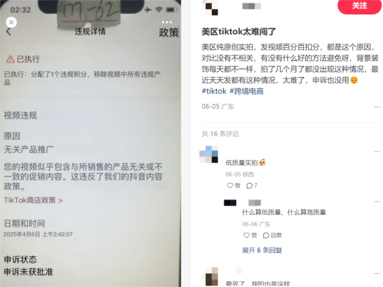 一位卖家在社交媒体上发帖称自己发布的短视频是纯原创实拍,但是也遭到平台的违规扣分处理,该卖家表示视频中的背景装饰每天都不一样,之前拍了几个月都没出现这种情况,但是最近天天都会出现“视频无关产品推广”的违规处理。