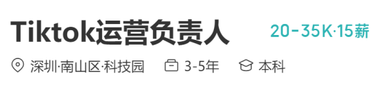 TikTok 运营负责人已经成为行业最抢手的岗位,深圳、广州的企业甚至开出月薪 3.5 万元的待遇。